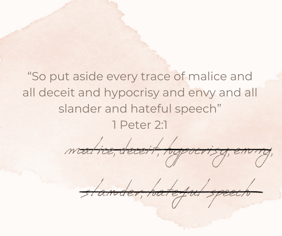 We hear constantly that we are daughters of the Most High, we were created in His image, and we are perfect in God’s eyes. We hear all these truths about ourselves, but do we believe them? 1 Peter 2:1 says, “Therefore, rid yourselves of all malice and all deceit, hypocrisy, envy, slander of every kind.” How many times are you deceived by your own thoughts, or you are being hypocritical from what you say aloud to what you have in your head, or you tell yourself false information? Unfortunately, it’s probably more than we like to admit.